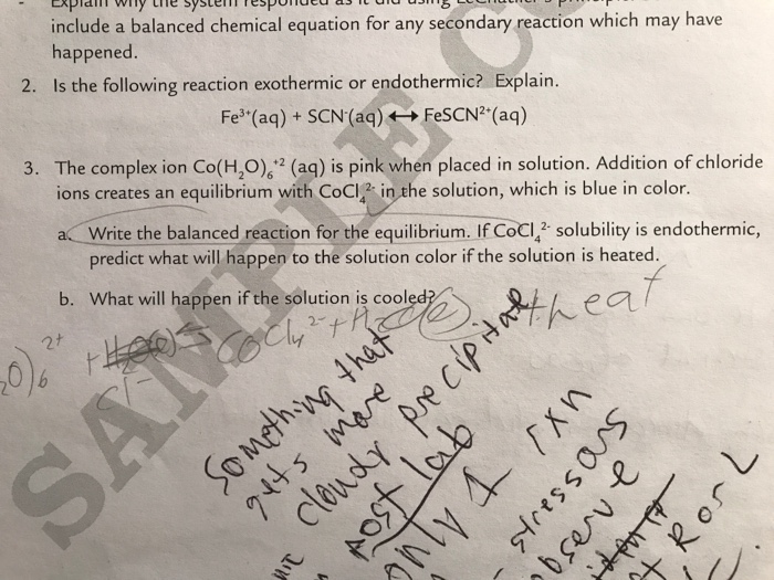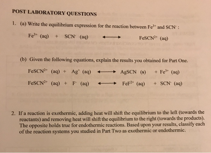 Write a molecular equation for the precipitation reaction that occurs if any when the following solutions are mixed. Also is FeSCN2 endothermic or exothermic. Le Chateliers Principle predicts that the equilibrium position will shift in order to.